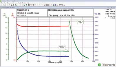 Traditional Goodrich flexometers have been designed to determine the resistance of the rubber compound to a temperature increase; they measure the temperature in the contact area between the specimen and the compression device while applying a continuous sinusoidal dynamic excitation under controlled strain.